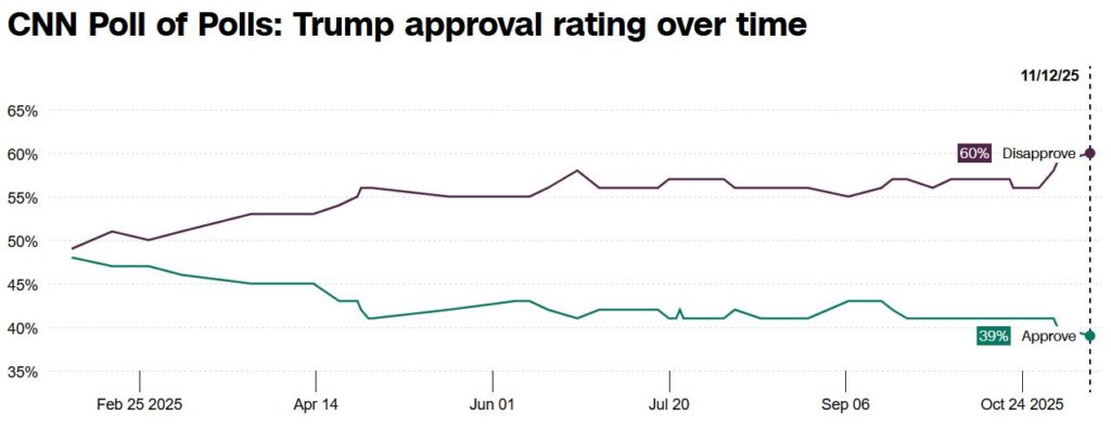 Recent polls show President Donald Trump’s approval rating have reached new lows in his second-term. As of November 9th, his net approval stood at -18% according to The Economist: 58% of Americans disapprove of the job he’s doing, 39% approve, and 4% remain unsure. The CNN Poll of Polls reports similar numbers, with 60% disapproving and 39% approving of Trump’s performance as president.